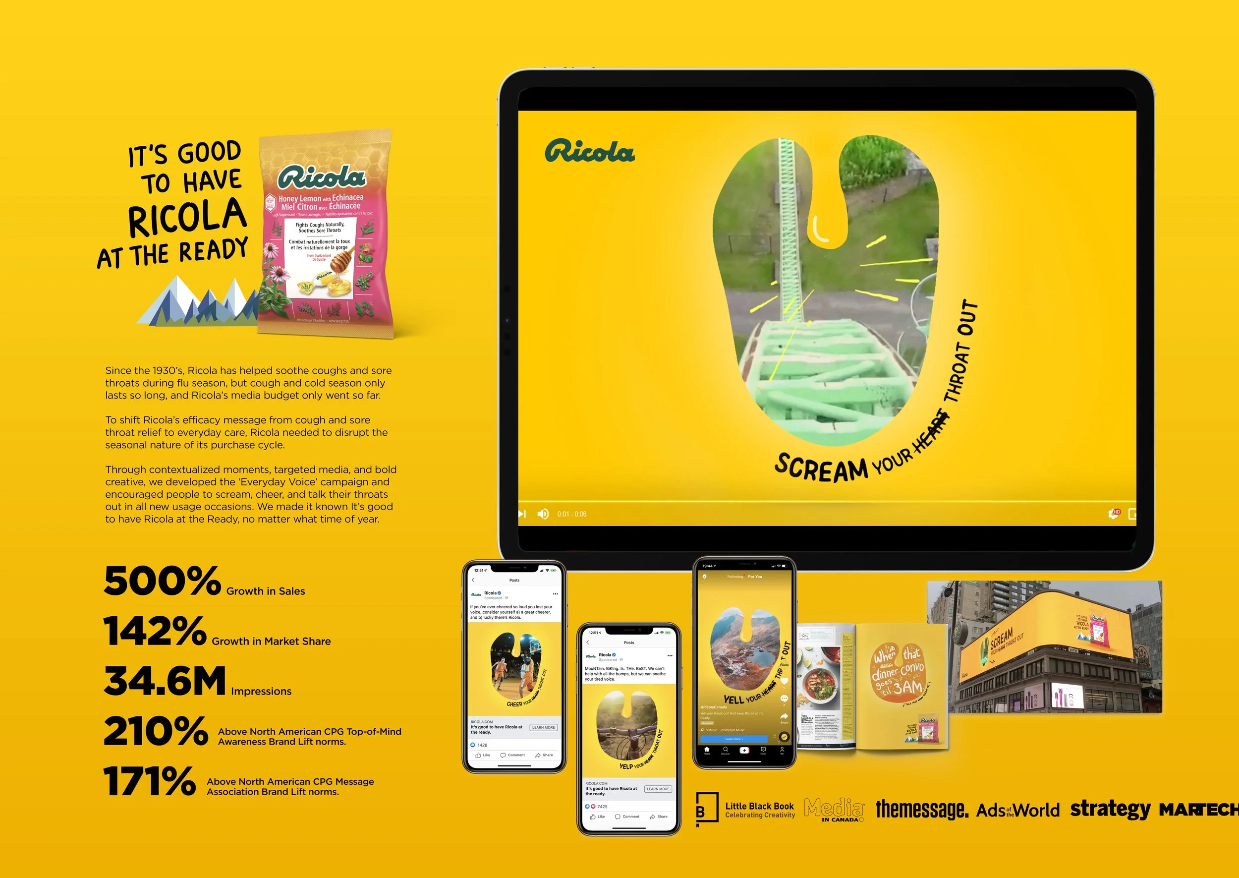 I helped maintain and execute paid social media for Ricola’s award-winning Everyday Voice campaign — a humorous, efficacy-focused platform celebrating the small everyday voice moments we take for granted (and often lose when sick).